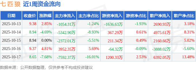 资金流向数据方面,本周七 匹 狼主力资金合计净流出1.24亿元,游资资金合计净流入78.01万元,散户资金合计净流入1.23亿元。本周资金流向一览见下表: