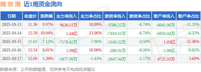资金流向数据方面,本周南 京 港主力资金合计净流入2.58亿元,游资资金合计净流出1.73亿元,散户资金合计净流出8550.87万元。本周资金流向一览见下表: