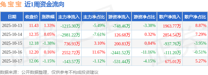 资金流向数据方面,本周兔 宝 宝主力资金合计净流出1050.44万元,游资资金合计净流出3393.91万元,散户资金合计净流入4444.35万元。本周资金流向一览见下表: