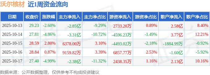 资金流向数据方面,本周沃尔核材主力资金合计净流出6.99亿元,游资资金合计净流入2940.06万元,散户资金合计净流入6.7亿元。本周资金流向一览见下表: