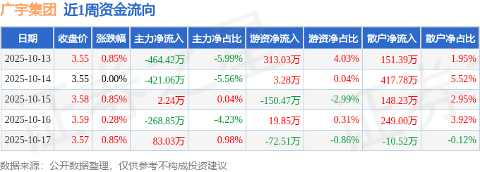 资金流向数据方面,本周广宇集团主力资金合计净流出1069.07万元,游资资金合计净流入113.19万元,散户资金合计净流入955.88万元。本周资金流向一览见下表: