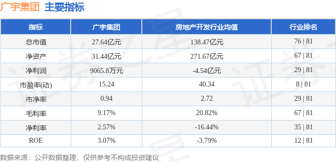 广宇集团(002133)主营业务:房地产开发与销售,同时公司经营与房地产相关的物业管理、物业出租、材料销售等业务。 广宇集团2025年中报显示,公司主营收入29.44亿元,同比上升36.44%;归母净利润9065.8万元,同比上升248.5%;扣非净利润8835.47万元,同比上升238.78%;其中2025年第二季度,公司单季度主营收入20.78亿元,同比上升154.83%;单季度归母净利润1.29亿元,同比上升299.98%;单季度扣非净利润1.28亿元,同比上升295.64%;负债率60.71%,投资收益1322.81万元,财务费用4643.73万元,毛利率9.17%。