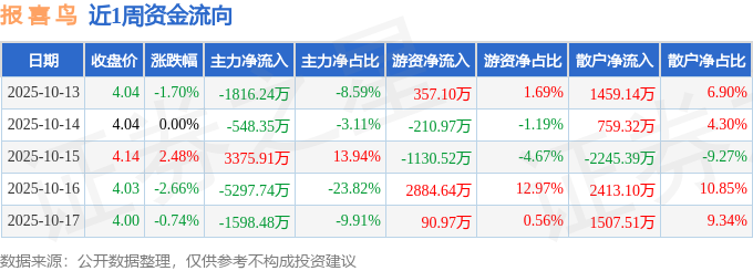 资金流向数据方面,本周报 喜 鸟主力资金合计净流出5884.89万元,游资资金合计净流入1991.22万元,散户资金合计净流入3893.67万元。本周资金流向一览见下表: