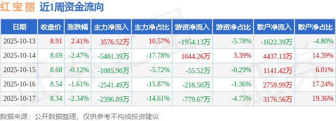 资金流向数据方面,本周红 宝 丽主力资金合计净流出7929.14万元,游资资金合计净流出1963.57万元,散户资金合计净流入9892.71万元。本周资金流向一览见下表:
