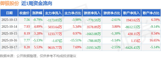 资金流向数据方面,本周御银股份主力资金合计净流入4035.33万元,游资资金合计净流出2836.93万元,散户资金合计净流出1198.4万元。本周资金流向一览见下表: