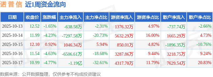 资金流向数据方面,本周诺 普 信主力资金合计净流出2.53亿元,游资资金合计净流入1.55亿元,散户资金合计净流入9879.49万元。本周资金流向一览见下表: