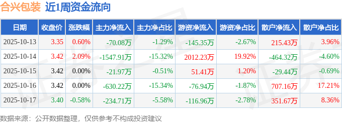 资金流向数据方面,本周合兴包装主力资金合计净流出2504.88万元,游资资金合计净流入1724.38万元,散户资金合计净流入780.5万元。本周资金流向一览见下表: