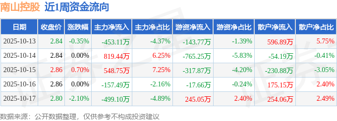 资金流向数据方面,本周南山控股主力资金合计净流入258.47万元,游资资金合计净流出999.5万元,散户资金合计净流入741.03万元。本周资金流向一览见下表: