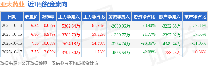 资金流向数据方面,本周亚太药业主力资金合计净流入2.05亿元,游资资金合计净流出1.13亿元,散户资金合计净流出9195.91万元。本周资金流向一览见下表: