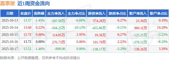 资金流向数据方面,本周嘉事堂主力资金合计净流出510.34万元,游资资金合计净流出107.6万元,散户资金合计净流入617.94万元。本周资金流向一览见下表: