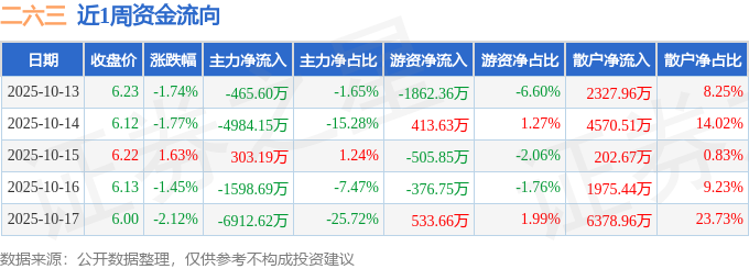 资金流向数据方面,本周二六三主力资金合计净流出1.37亿元,游资资金合计净流出1797.67万元,散户资金合计净流入1.55亿元。本周资金流向一览见下表: