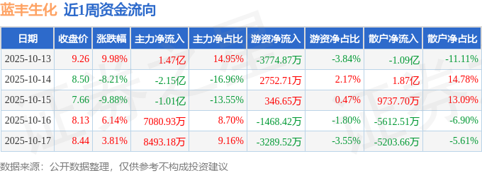资金流向数据方面,本周蓝丰生化主力资金合计净流出1280.29万元,游资资金合计净流出5433.46万元,散户资金合计净流入6713.75万元。本周资金流向一览见下表:
