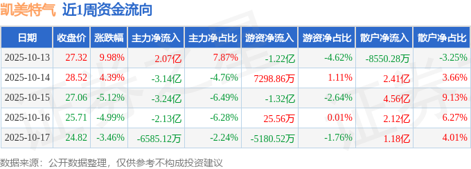 资金流向数据方面,本周凯美特气主力资金合计净流出7.09亿元,游资资金合计净流出2.32亿元,散户资金合计净流入9.41亿元。本周资金流向一览见下表: