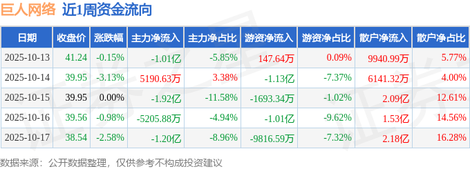 资金流向数据方面,本周巨人网络主力资金合计净流出4.13亿元,游资资金合计净流出3.28亿元,散户资金合计净流入7.41亿元。本周资金流向一览见下表: