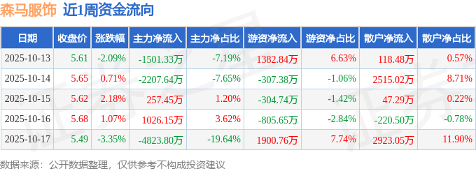 资金流向数据方面,本周森马服饰主力资金合计净流出7249.17万元,游资资金合计净流入1865.83万元,散户资金合计净流入5383.34万元。本周资金流向一览见下表: