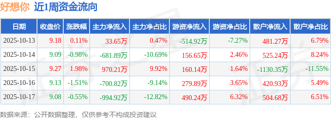 资金流向数据方面,本周好想你主力资金合计净流出1373.77万元,游资资金合计净流入572.01万元,散户资金合计净流入801.77万元。本周资金流向一览见下表: