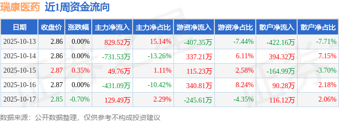 资金流向数据方面,本周瑞康医药主力资金合计净流出153.86万元,游资资金合计净流入140.29万元,散户资金合计净流入13.57万元。本周资金流向一览见下表: