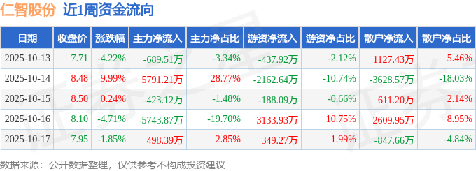 资金流向数据方面,本周仁智股份主力资金合计净流出566.89万元,游资资金合计净流入694.54万元,散户资金合计净流出127.65万元。本周资金流向一览见下表: