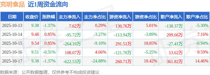 资金流向数据方面,本周克明食品主力资金合计净流出866.65万元,游资资金合计净流入447.34万元,散户资金合计净流入419.31万元。本周资金流向一览见下表: