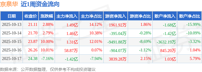 资金流向数据方面,本周京泉华主力资金合计净流入2.84亿元,游资资金合计净流出4989.79万元,散户资金合计净流出2.34亿元。本周资金流向一览见下表: