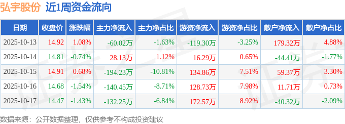 资金流向数据方面,本周弘宇股份主力资金合计净流出498.82万元,游资资金合计净流入333.15万元,散户资金合计净流入165.67万元。本周资金流向一览见下表: