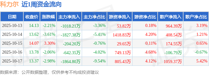 资金流向数据方面,本周科力尔主力资金合计净流出5556.94万元,游资资金合计净流入3056.86万元,散户资金合计净流入2500.07万元。本周资金流向一览见下表: