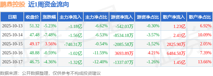 证券之星消息,截至2025年10月17日收盘,鹏鼎控股(002938)报收于46.75元,较上周的54.15元下跌13.67%。本周,鹏鼎控股10月13日盘中最高价报52.43元。10月17日盘中最低价报46.6元。鹏鼎控股当前最新总市值1083.69亿元,在元件板块市值排名6/56,在两市A股市值排名157/5158。