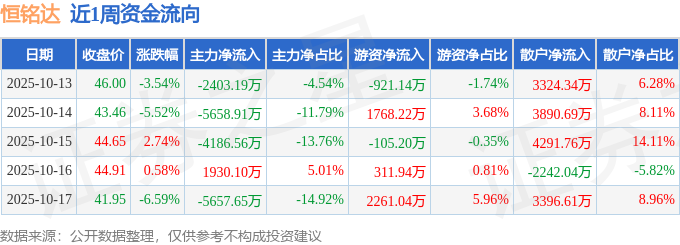 资金流向数据方面,本周恒铭达主力资金合计净流出1.6亿元,游资资金合计净流入3314.85万元,散户资金合计净流入1.27亿元。本周资金流向一览见下表: