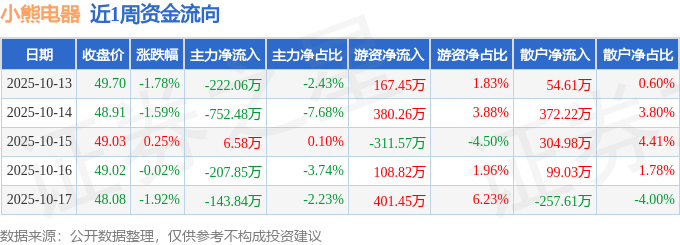 资金流向数据方面,本周小熊电器主力资金合计净流出1319.64万元,游资资金合计净流入746.41万元,散户资金合计净流入573.23万元。本周资金流向一览见下表: