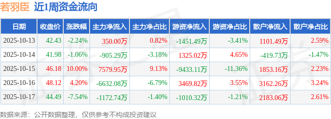 资金流向数据方面,本周若羽臣主力资金合计净流出780.16万元,游资资金合计净流出7100.08万元,散户资金合计净流入7880.24万元。本周资金流向一览见下表: