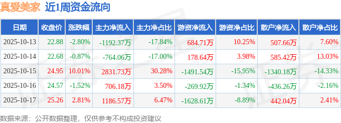 资金流向数据方面,本周真爱美家主力资金合计净流入2768.05万元,游资资金合计净流出2526.72万元,散户资金合计净流出241.33万元。本周资金流向一览见下表: