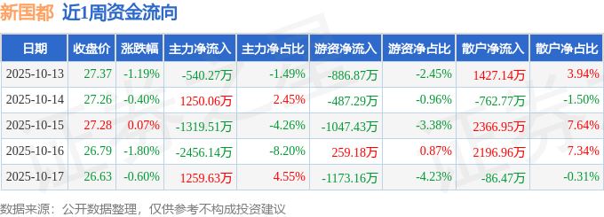 资金流向数据方面,本周新国都主力资金合计净流出1806.23万元,游资资金合计净流出3335.57万元,散户资金合计净流入5141.8万元。本周资金流向一览见下表: