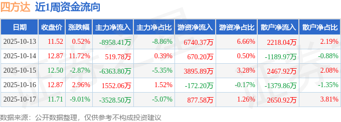 资金流向数据方面,本周四方达主力资金合计净流出1.68亿元,游资资金合计净流入1.2亿元,散户资金合计净流入4767.04万元。本周资金流向一览见下表: