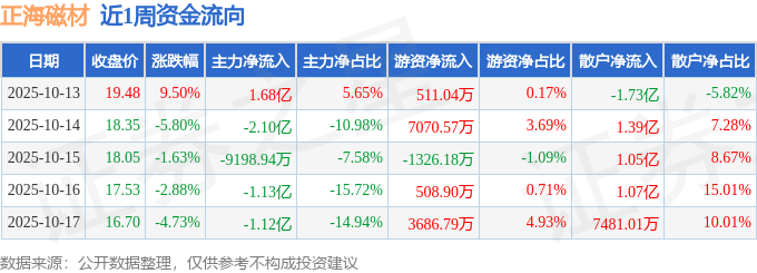 资金流向数据方面,本周正海磁材主力资金合计净流出3.58亿元,游资资金合计净流入1.05亿元,散户资金合计净流入2.54亿元。本周资金流向一览见下表: