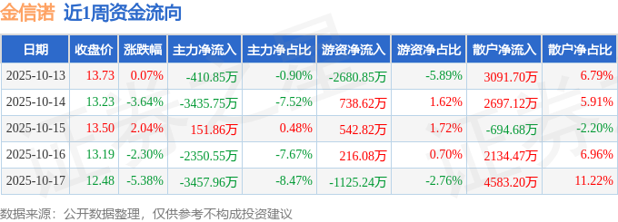 资金流向数据方面,本周金信诺主力资金合计净流出9503.24万元,游资资金合计净流出2308.56万元,散户资金合计净流入1.18亿元。本周资金流向一览见下表: