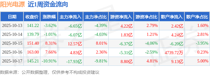 资金流向数据方面,本周阳光电源主力资金合计净流出13.24亿元,游资资金合计净流入3.17亿元,散户资金合计净流入10.06亿元。本周资金流向一览见下表: