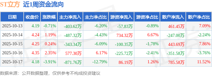 资金流向数据方面,本周ST立方主力资金合计净流出1528.74万元,游资资金合计净流入436.61万元,散户资金合计净流入1092.13万元。本周资金流向一览见下表: