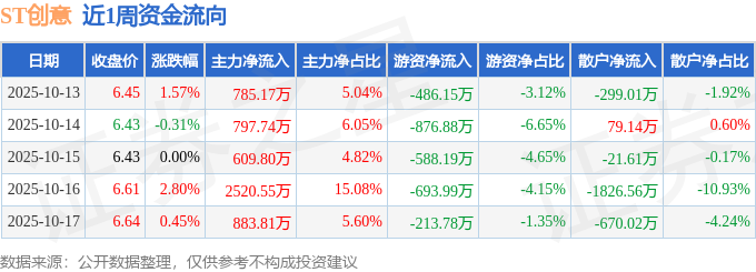 资金流向数据方面,本周ST创意主力资金合计净流入5597.07万元,游资资金合计净流出2859.0万元,散户资金合计净流出2738.07万元。本周资金流向一览见下表:
