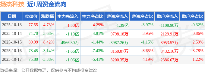 资金流向数据方面,本周扬杰科技主力资金合计净流出2.9亿元,游资资金合计净流入8227.56万元,散户资金合计净流入2.08亿元。本周资金流向一览见下表: