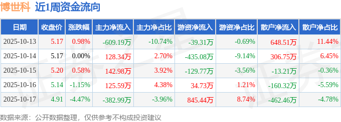 资金流向数据方面,本周博世科主力资金合计净流出595.26万元,游资资金合计净流入276.0万元,散户资金合计净流入319.26万元。本周资金流向一览见下表: