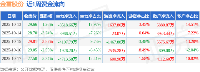 资金流向数据方面,本周金雷股份主力资金合计净流出2.32亿元,游资资金合计净流入3329.24万元,散户资金合计净流入1.99亿元。本周资金流向一览见下表: