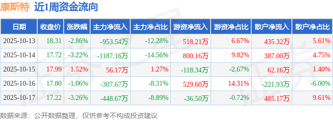 资金流向数据方面,本周康斯特主力资金合计净流出2840.86万元,游资资金合计净流入1693.14万元,散户资金合计净流入1147.73万元。本周资金流向一览见下表: