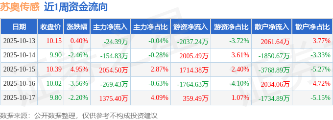 资金流向数据方面,本周苏奥传感主力资金合计净流入2981.25万元,游资资金合计净流入277.5万元,散户资金合计净流出3258.75万元。本周资金流向一览见下表: