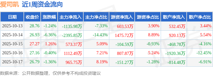 资金流向数据方面,本周爱司凯主力资金合计净流出880.22万元,游资资金合计净流入2631.26万元,散户资金合计净流出1751.04万元。本周资金流向一览见下表: