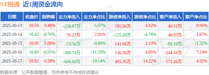 资金流向数据方面,本周ST路通主力资金合计净流出1260.7万元,游资资金合计净流入843.95万元,散户资金合计净流入416.75万元。本周资金流向一览见下表:
