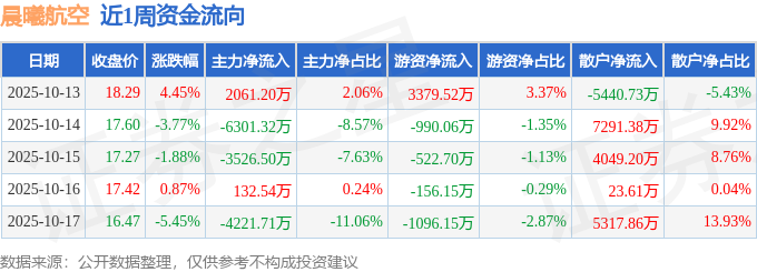 资金流向数据方面,本周晨曦航空主力资金合计净流出1.19亿元,游资资金合计净流入614.46万元,散户资金合计净流入1.12亿元。本周资金流向一览见下表: