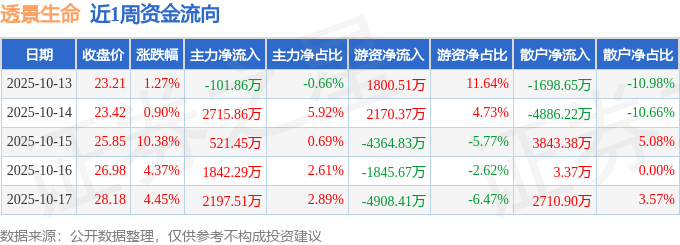 资金流向数据方面,本周透景生命主力资金合计净流入7175.25万元,游资资金合计净流出7148.04万元,散户资金合计净流出27.21万元。本周资金流向一览见下表: