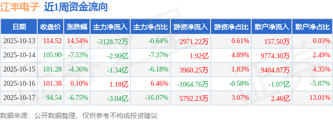 资金流向数据方面,本周江丰电子主力资金合计净流出6.4亿元,游资资金合计净流入3.08亿元,散户资金合计净流入3.32亿元。本周资金流向一览见下表: