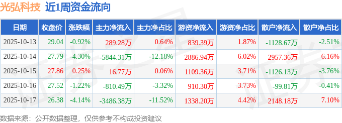 资金流向数据方面,本周光弘科技主力资金合计净流出9835.13万元,游资资金合计净流入7084.2万元,散户资金合计净流入2750.93万元。本周资金流向一览见下表: