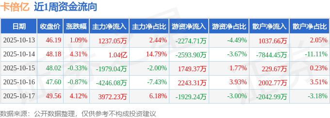 资金流向数据方面,本周卡倍亿主力资金合计净流入9422.51万元,游资资金合计净流出2805.17万元,散户资金合计净流出6617.34万元。本周资金流向一览见下表: